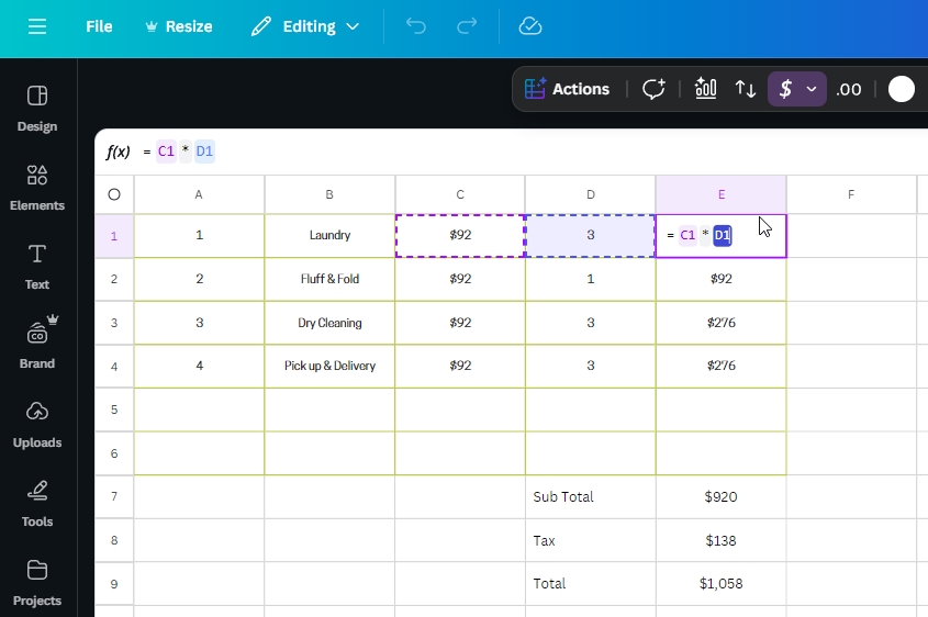 Item QTY Price Total Logo Design 2 $50 =B2*C2 -